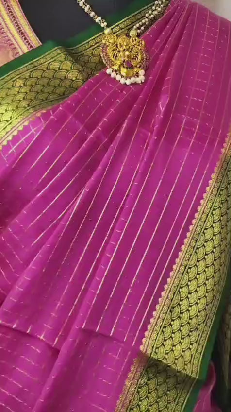 Elegant and timeless, this Pure Mysore Crepe Saree features a stunning Butta and Box color design. Crafted from 120 GSM premium crepe, it offers a lightweight yet rich drape — ideal for both traditional and festive occasions.-