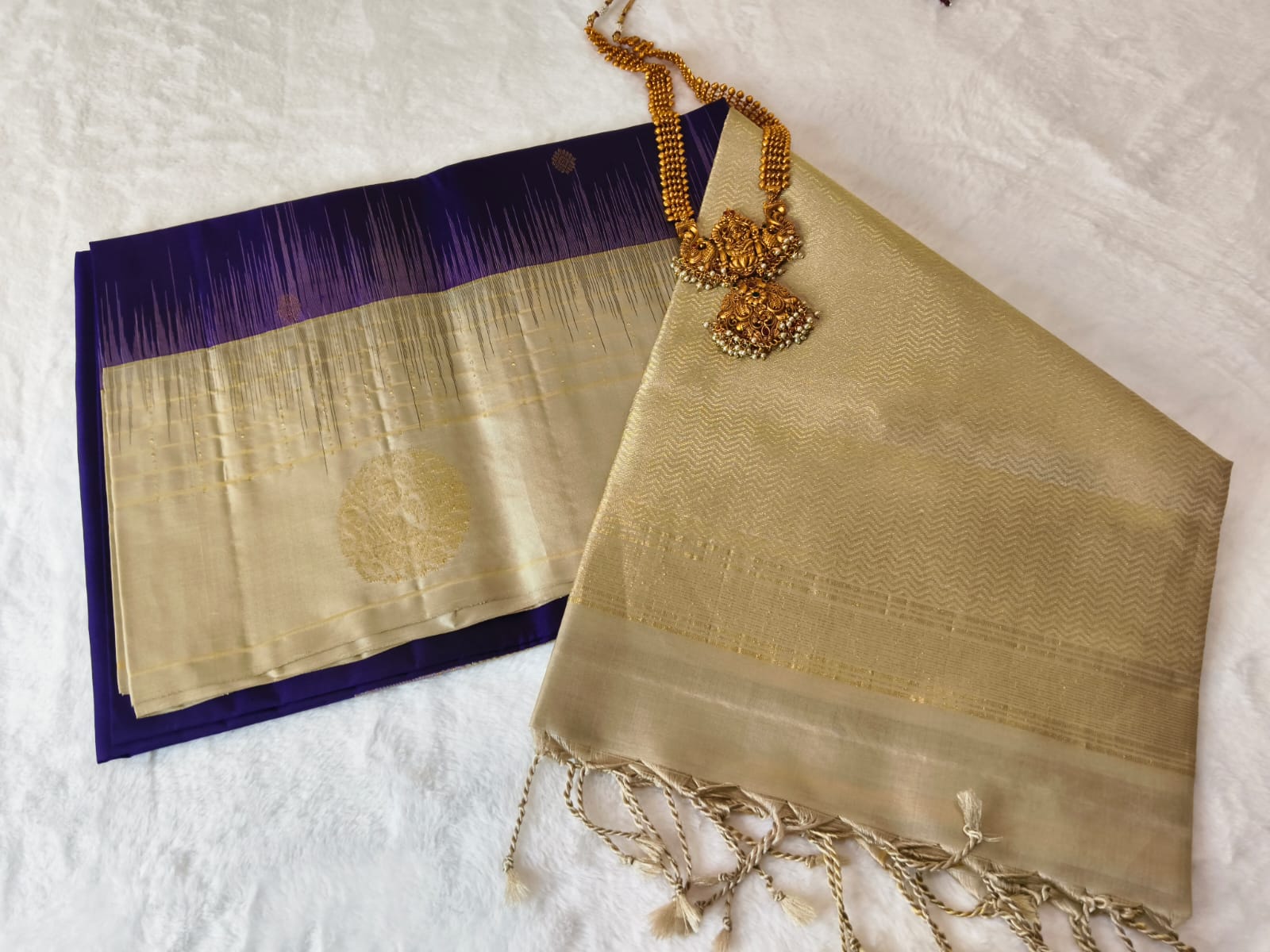 An exquisite pure silk saree in cream and royal purple, blending elegance with subtle grandeur. The body features soft gold zari motifs and gradient weave detailing that flows into a rich purple border — perfect for weddings, receptions, or festive celebrations.