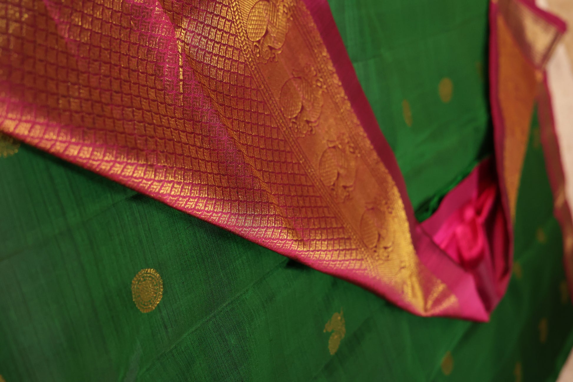 This Small Border Pure Silk Saree features a Pink border with delicate Peacock motifs, offering classic beauty and modern charm.