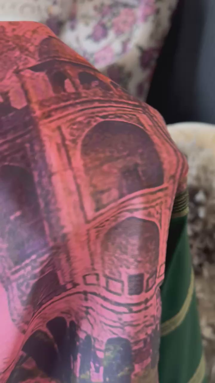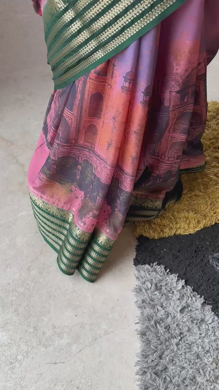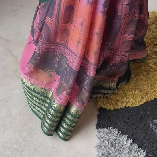 Inspired by the timeless architecture of the Taj Mahal, this saree features stunning digital artwork that looks like a hand-painted masterpiece. Crafted on luxurious Semi Mysore Crepe Silk, the drape is lightweight, graceful, and effortlessly classy.